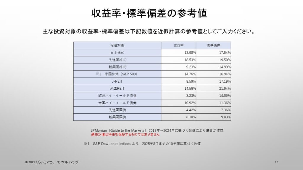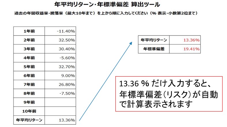 過去年の平均リターンを入力するだけで、自動的にリスク(標準偏差)が計算されます