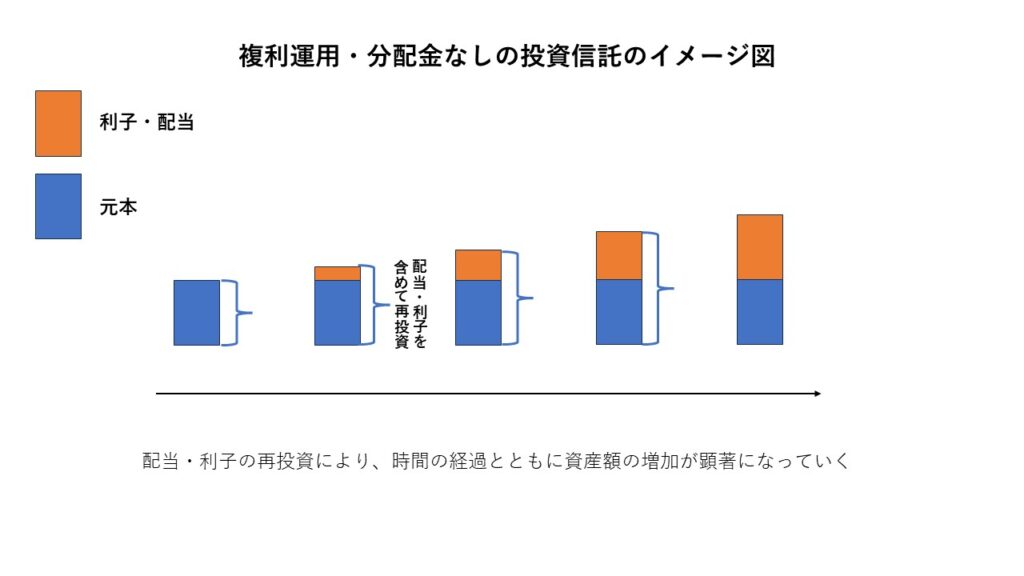分配金再投資型は、運用で得られた利益を現金で受け取らず、すべて再投資します。