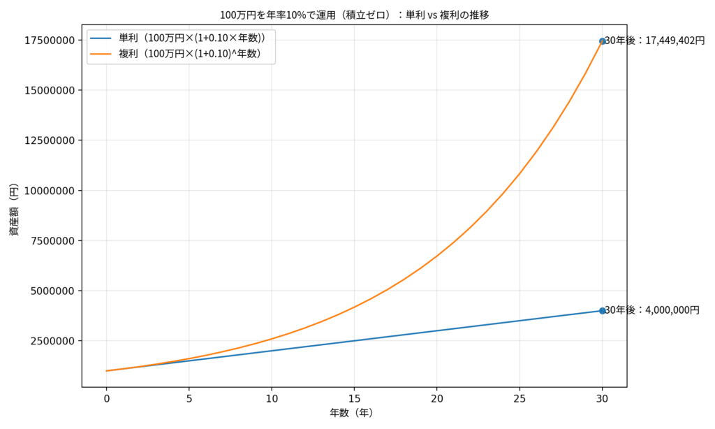 上図の上は、複利と単利の推移の違いを表しています。