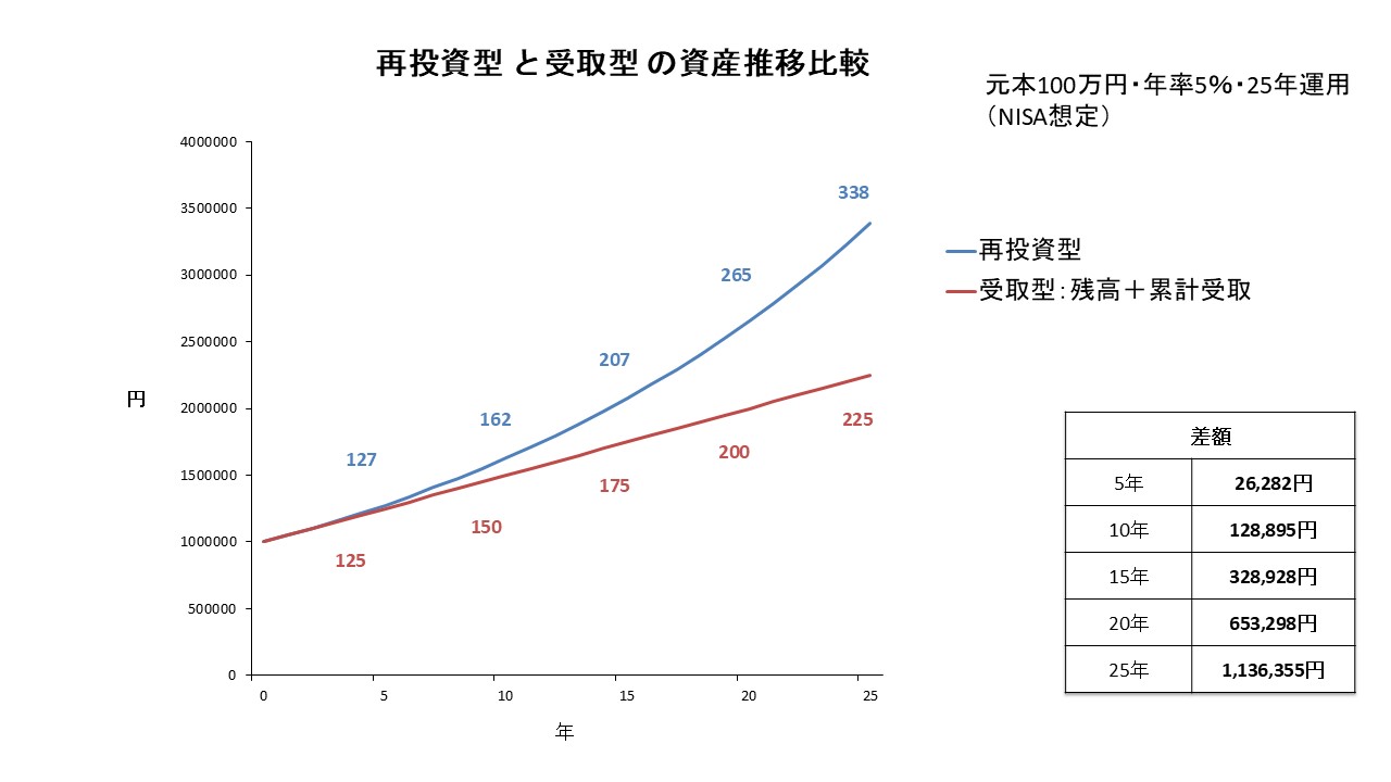 上図の下は、配当・利子が元本に加え再投資され、運用額の拡大に勢いがつくことが確認できます。