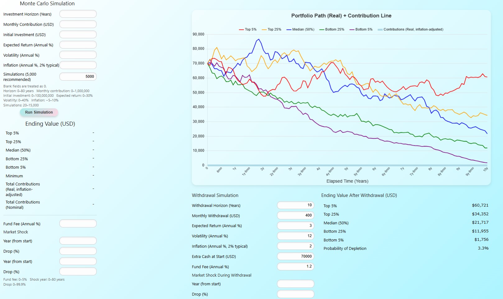 - See how varying the contribution amount and risk level affects the result.